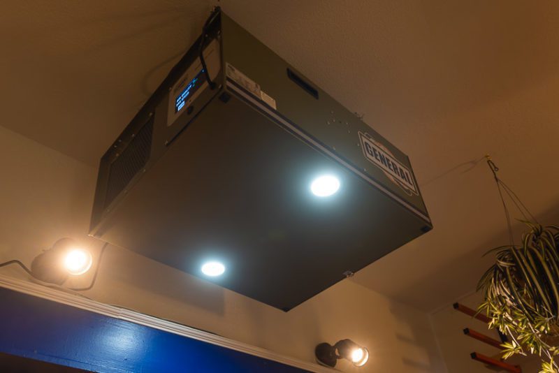 General’s Ceiling Air Filtration System is designed to hang directly from the ceiling. The unit thoughtfully includes two LED lights to illuminate the area directly below it. The lights are operated by the remote control. They are not super bright, but they are helpful nonetheless. My only complaint is the color temperature of the lights. The lights don’t just lean toward the cool blue side of the spectrum. They are what I call “hospital-make-everyone-as-ugly-as-possible cool blue.” I covered mine with a Soft Amber gel to correct the color and make it match the rest of my lights.
