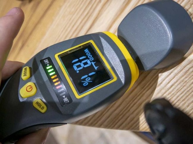 The MM7 General Tools moisture meter has a hold function that keeps your reading on the screen. It also auto-calibrates for detecting materials at least 3/8โณ thick. You can check the calibration by removing the pin cover and testing the pins in the calibration holes. If the reading falls outside of the acceptable range (17.3% โ 19.3%), itโs no longer reading properly.