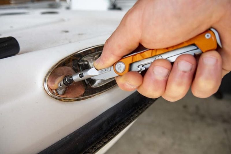 The downside is that there’s no lock for the driver. As you rotate the tool around, you inevitably cause it to fold down as the torque increases. It’s not a complete deal-breaker, though. I find that turning the driver 90º against the frame and using more like a T-handle driver lets me apply more torque and is more effective at keeping the bit engaged.