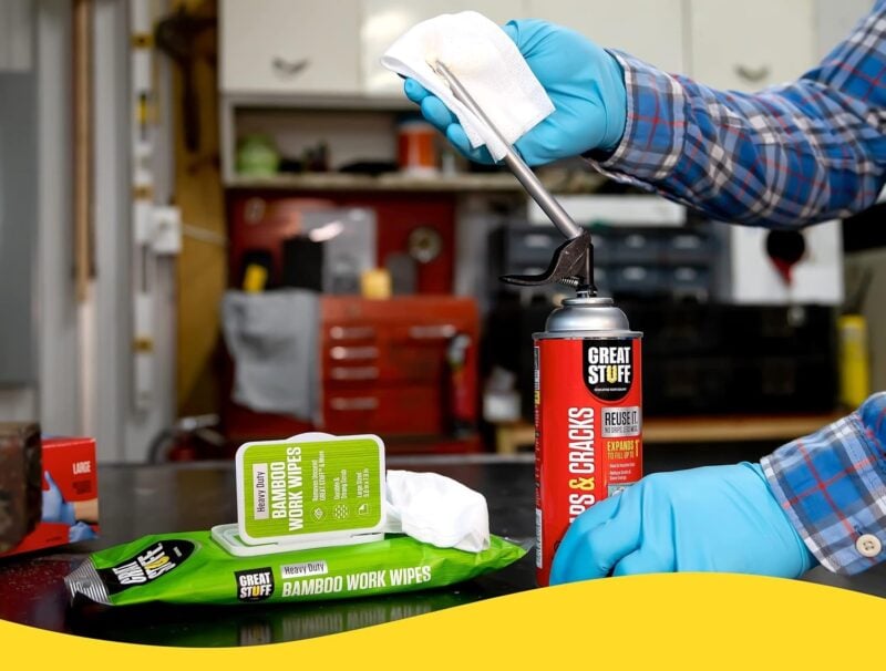 Great Stuff Work Wipes can safely clean most tools, hard surfaces, and hands. No harsh solvents means no harsh chemical smell. As soon as the inevitable spill, drip, or misapplication happens, users can simply grab a durable, citrus-scented wipe from the resealable pack and be confident that their projects can continue quickly.