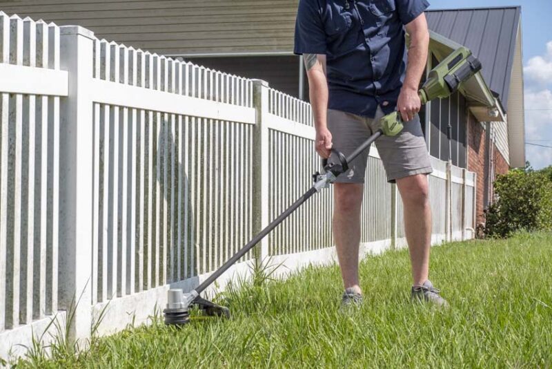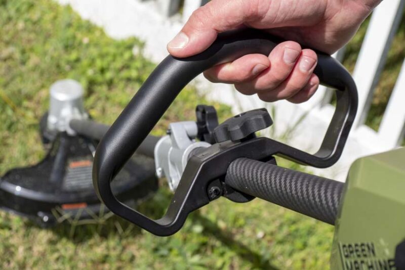 Green Machine uses a brushless motor to power this string trimmer. Using 0.095-inch line, it tops out at 6300 RPM in high speed. There’s a low gear that’s useful on thinner sections when you want to preserve runtime.