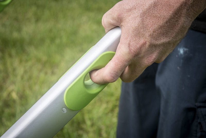 Like many battery-powered mowers, you can fold the handle forward on this model and store it vertically. Itโs a really easy system, too. Just pull the green tabs up to release and swing the handle forward. Theyโre the same releases you use to switch between the two handle heights. A handle on the front gives you a simple point to pull it up from.