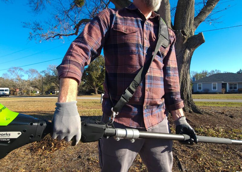 To help take some of the weight off your arms, Greenworks included a removable shoulder sling. This sling also creates a natural pivot point to help you maneuver the saw as you cut.