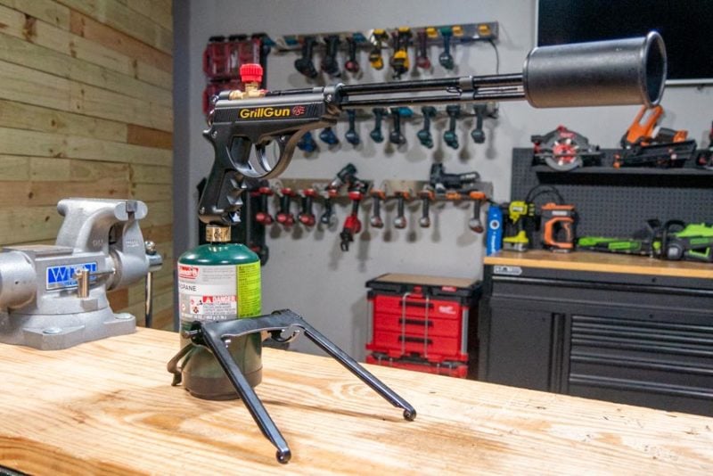 The GrillBlazer GrillGun Basic runs for $179.99 and includes a collapsible metal โ€œbottle standโ€ which holds the gun upright with a propane bottle attached. GrillBlazer also has a variety of combo kits and accessories to take the experience further.