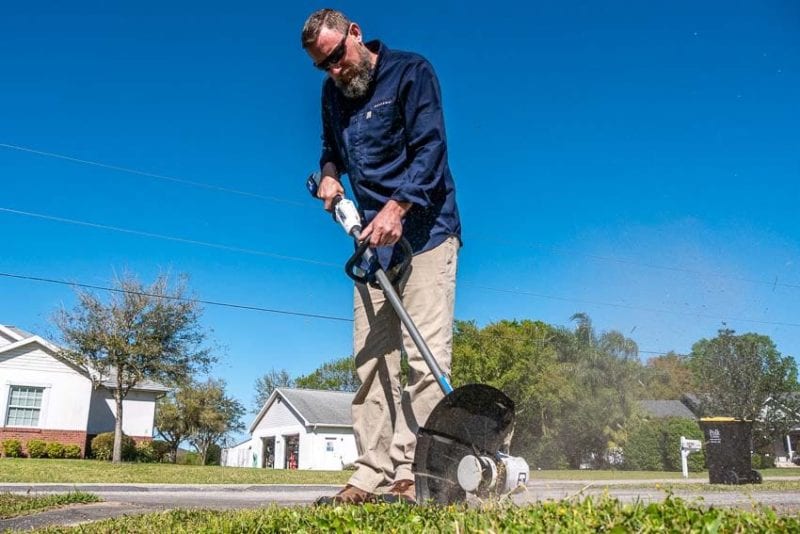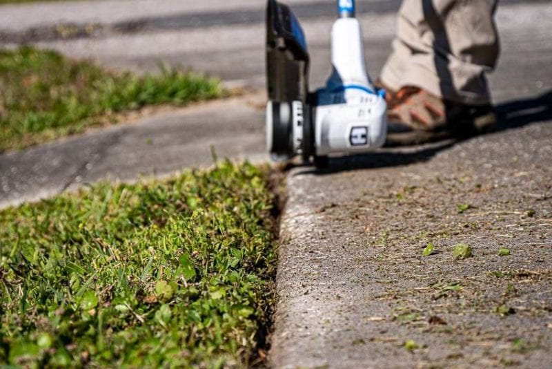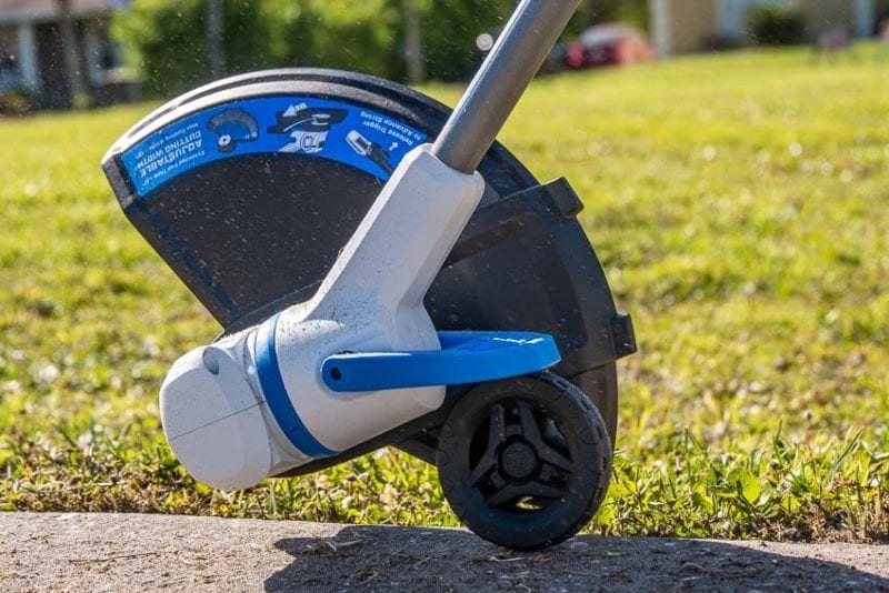 Essentially, this accomplishes the same feat as turning your string trimmer over on its side. The difference, however, is the built-in guide wheel. It lets you glide smoothly over the concrete while you edge. It operates more closely to an actual edgerโjust using string instead of a metal blade.