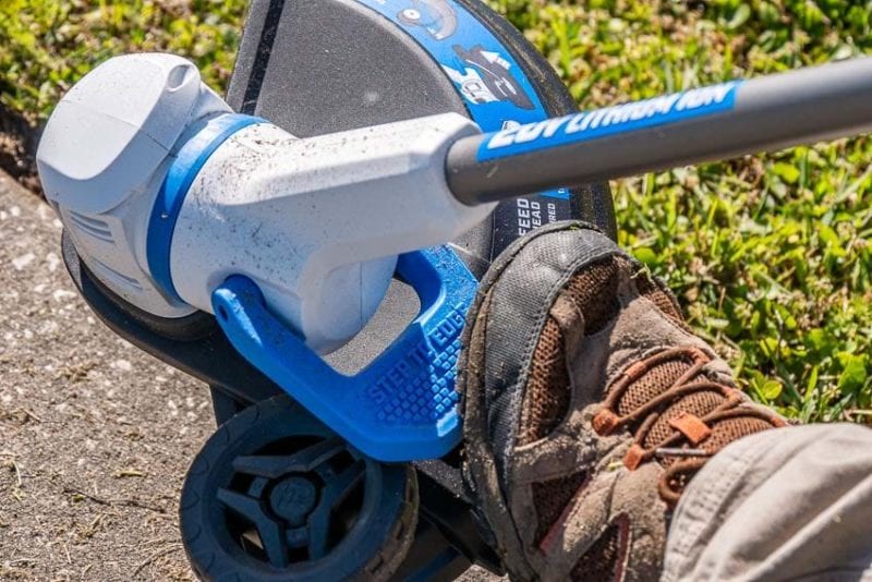 A variable-speed trigger provides you with adequate control over the work. We were able to easily transition from cutting thick grass to lighter overgrowth with enough precision to extend the battery run-time.