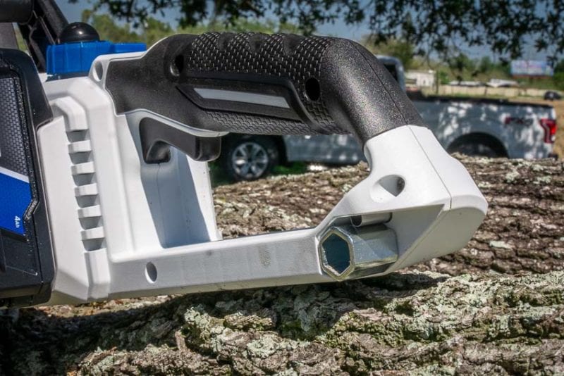 The Hart HGCS021 20V 12-inch Chainsaw weighs just 8.4 lbs, which keeps arm fatigue at bayโat least for a while. Hart also provides a rear comfort grip that worked well with our gloves. We also liked the oversized front handle. It gave plenty of space for our gloved hands to find a variety of comfortable positions.