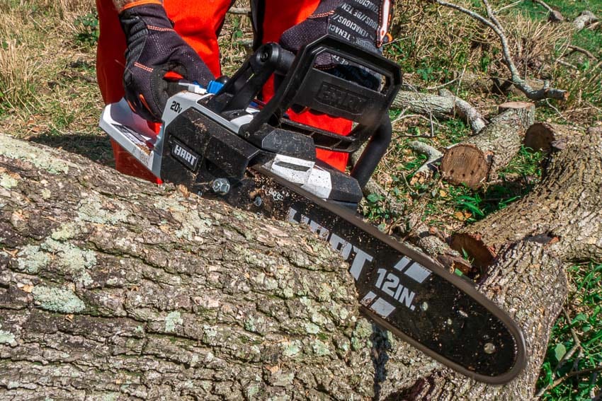 The brushed motor on this saw has the muscle to drive the chain through branches up to 10โณ in diameter. Thatโs great for light limbing and for trimming smaller trees and bushes around the yard. We actually had a fallen oak tree to deal with, and we found that this saw handled the lighter work efficiently and comfortably.