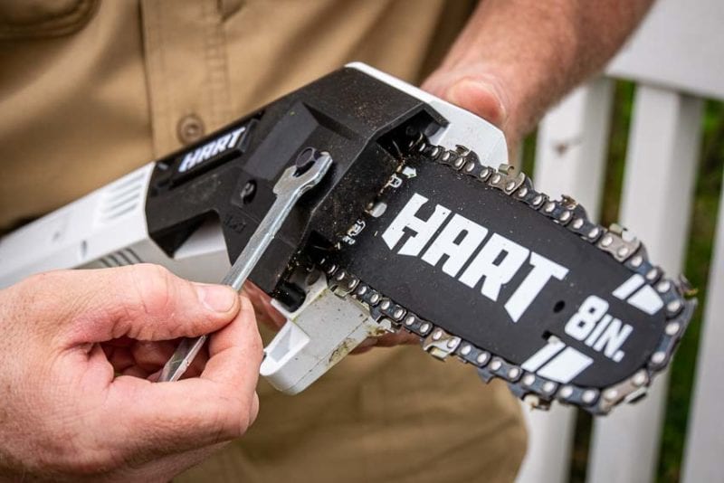 The Hart 20V Pole Saw features an 8โ€ณ bar and chain that can tackle branches up to 6โ€ณ thick. You have your chain tension adjustment and bar nut that can both be fiddled with via the scrench that stores away at the back of the cutting head.