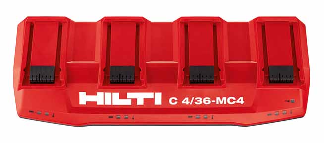 The new Hilti Multi-Bay Charger C4/36-MC worksย with all Hilti lithium-ionย batteries (though 12V batteries will need an adapter) and is designed toย keep contractors productive for the entire work day. The smart charger filters all power to the first battery placed on the charger. In just 25 minutes, the charger can kick theย battery up to 80% capacity. Once the first battery is completelyย charged, the systemย then charges the remaining batteries in the order they were installed.