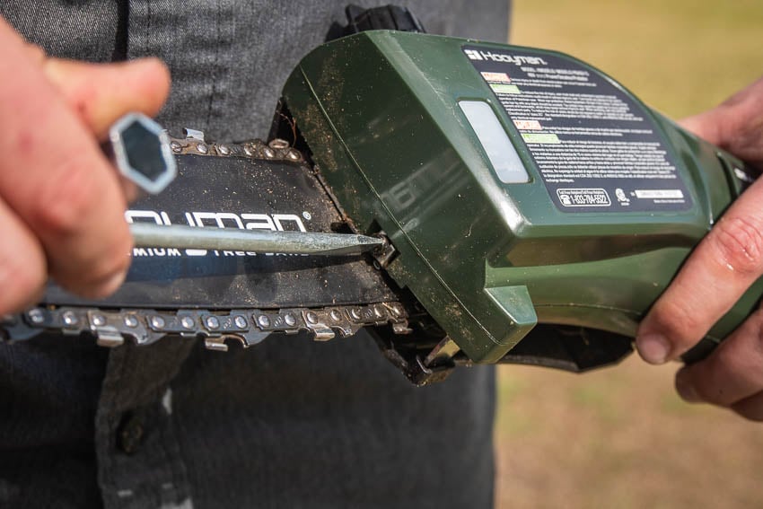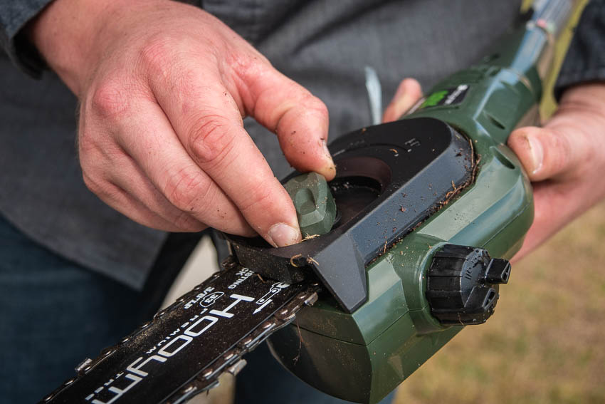 While we donโt mind using a scrench for tension adjustments, the location of the tensioner screw on this particular model is slightly inconvenient. The screw is nestled right up against the bar so itโs somewhat difficult to manipulate with the kitted scrench. Itโs not a complete deal-breaker for us but itโs something weโd like to see updated in future generations of this saw.