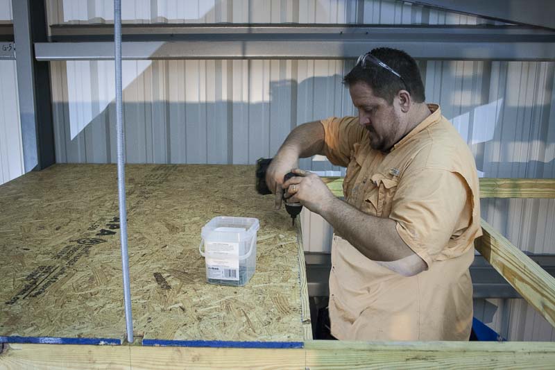 We decided to build a 6-foot deep shelf along the far gableย wall opposite our main 12ร14 Clopay commercial garage door and tie that into another shelf only 4 feet deep along theย west wall.ย The back of the shelves would be supported by the horizontal purlin that hovers around the 8 feet mark (from the concrete floor). The front of the shelf would be suspended; therefore, the support would come from allthread attached to the steel roof purlins. The fascia of each shelf would be 2ร6 pressure-treated lumber with the rest of the framing being constructedย out of standard 2ร4 pine. The decking would be 1/2โ OSBโafter all, we wouldnโt be walking around up there.