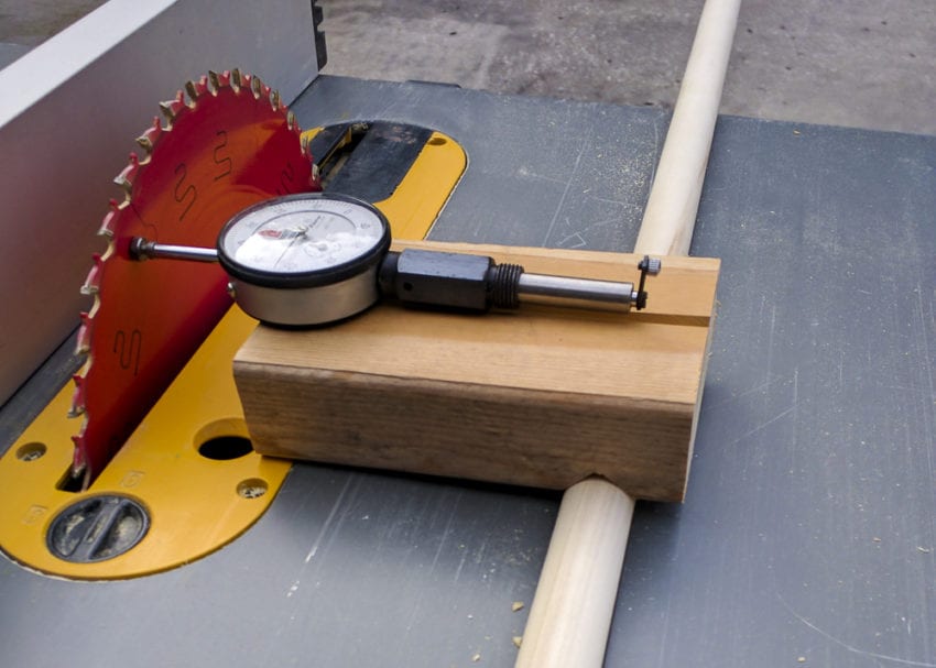 Not surprisingly, the more sophisticated the tool, the more accurate the measurement. You can use a precision ruler, calipers, a creative method of your own, or our preference: a dial indicator. Whatever you choose, be sure there isย no play in the miter guide as you measure the distance from it to the frontย and the back of the blade. This reveals how out of square the blade is to the miter slot. The more granular your measurement, the more accurate you can be.