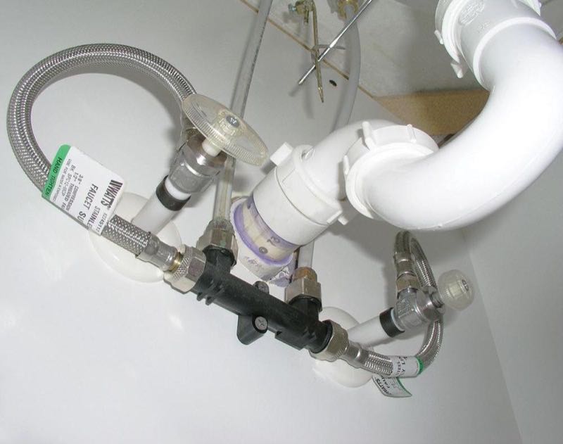 Then I proceeded to connect up the piping to the correct points on the valve. There are two sets of connections that were clearly labeled. One set feeds the faucet and one set is where the water supply comes into the valve. The included flexible water lines are designed to connect the bypass valve to the water supply valves. Once all the connections were tight we were finished here.