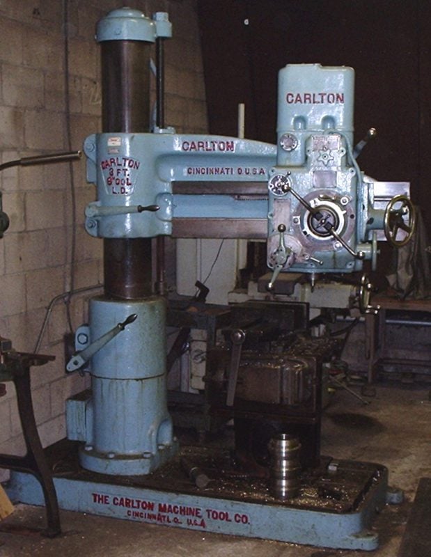 A radial drill press has a horizontal column in addition to a vertical column. This lets you drill to the center of much larger workpieces, as much as 34-inches for some small benchtop models. I have wanted one for years. They are rather expensive and take up a lot of space. Always bolt down these top-heavy tools so they donโt tip over. The advantage though is that the column almost never gets in your way, so you can put all sorts of things in a radial drill press you normally cannot, like an entire bicycle or your pickup truck tailgate.ย