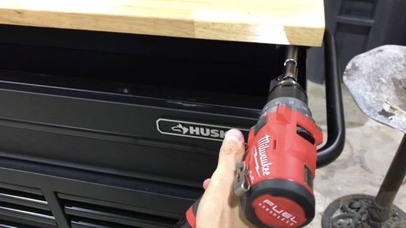 The Husky 72-inch Mobile Workbench makes for the most innovative and obvious feature this workbench has to offer. You can raise and lower the top using an included crank handle. It takes 72 turns to get from fully-seated (38โ€ณ tall) to its maximum height of 51โ€ณ but we found a workaround for that. Using a 10mm Allen socket and a Milwaukeeย FUEL 12V drillย we found we could raise and lower the table in mere seconds. Just use Low speed and set the clutch at 10 to avoid damaging the mechanism. The wood top can handle up to 300 pounds according to Husky specificationsโ€”and we saw no reason to doubt that. Stability is provided by a sort of โ€œTโ€ design which keeps the top from twisting as it is raised and lowered from twin center posts.