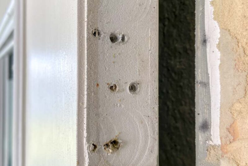 Of course, this begs the question: did the builder install a used door, or was it just shoddy work from the word โgoโ? Either way, itโs no surprise the door started to lean after seeing that many holes close together and how many of the screw threads werenโt actually holding.