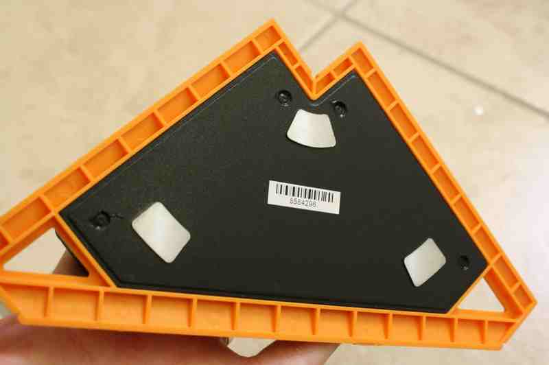 The flooring laser level has a mainย body that is made of orange plastic, but on the bottom, there is aย metal base plate that has three machined surfaces that contact theย floor. The reason for this is two-fold (we suspect). First, it adds weight to the base so it is sturdier, and second, with the three contact points, there is much less chance that the level will rock when set down. Mounted at 90 degrees to each other are two bubbleย level vials that make it so you can check the plane of the surfaceย you are working on in two directions. In line with these, bubble level vials are the red colored lasers that project out to about 30 feet indoors, depending on the lighting conditions.
