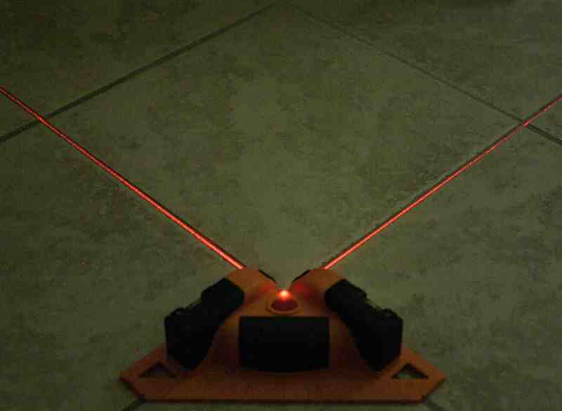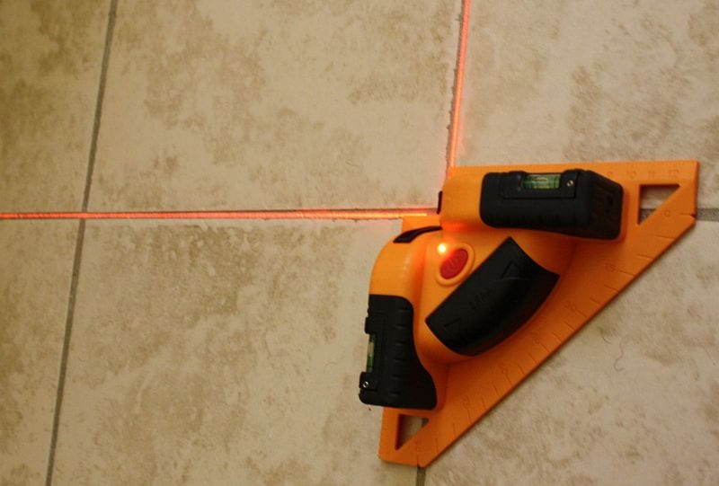No more will you have to draw lines or use a chalk box to mark outย where things need to be. I always used to think to myself how sillyย it was to go to all the trouble to lay out the tile floor on the subย flooring material, and then still have to measure and check once Iย started to lay the tile, because I covered all my markings withย thinset mortar. Now, once you have a tile or two placed, you can setย the laser level on them and use it to project the straight linesย right over whatever material is in its path.