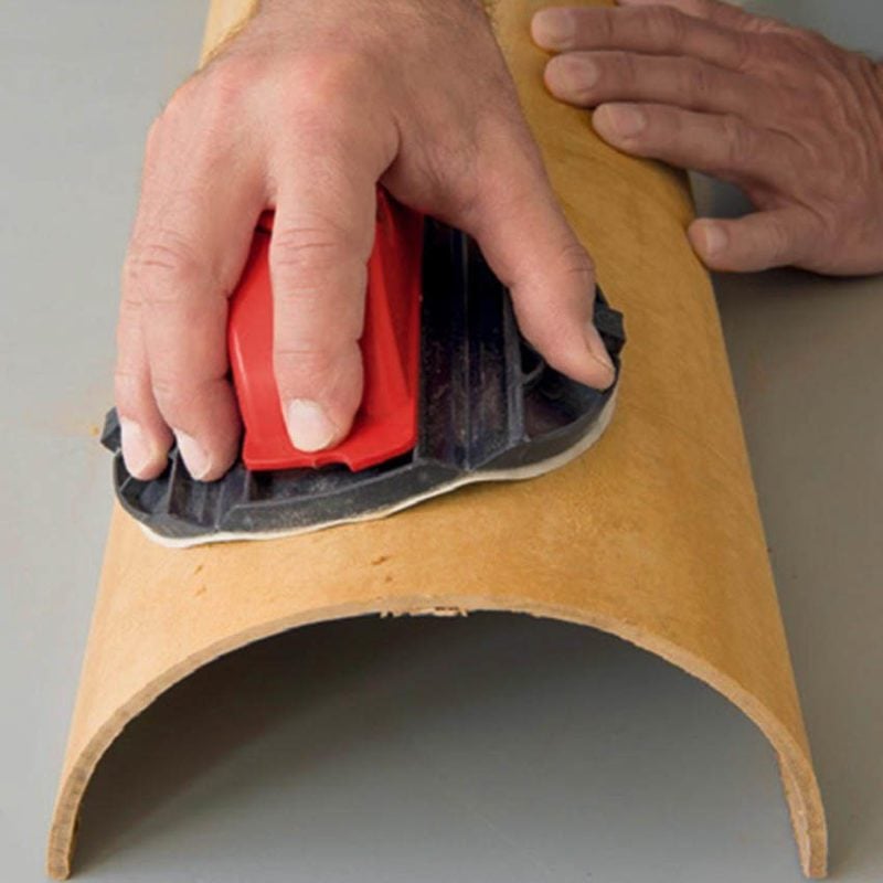 The Kapro Flex Sander has a 6โณ base and works with a standard piece of 6โณ sandpaper with Velcro backing. It features a solid center for stability and wings that can fold up or down independently of one another to accommodate all the angles of your workpiece. It gets into tight spots, corners, narrow spaces, grooves, and works on flat or curved surfaces.