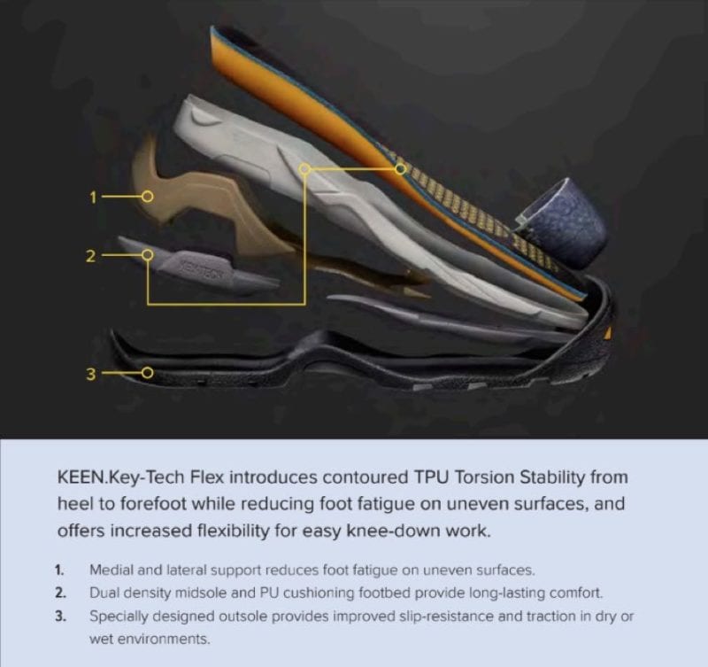 - Keen.Key-Tech Flex contoured underfoot support provides structured stability and comfort