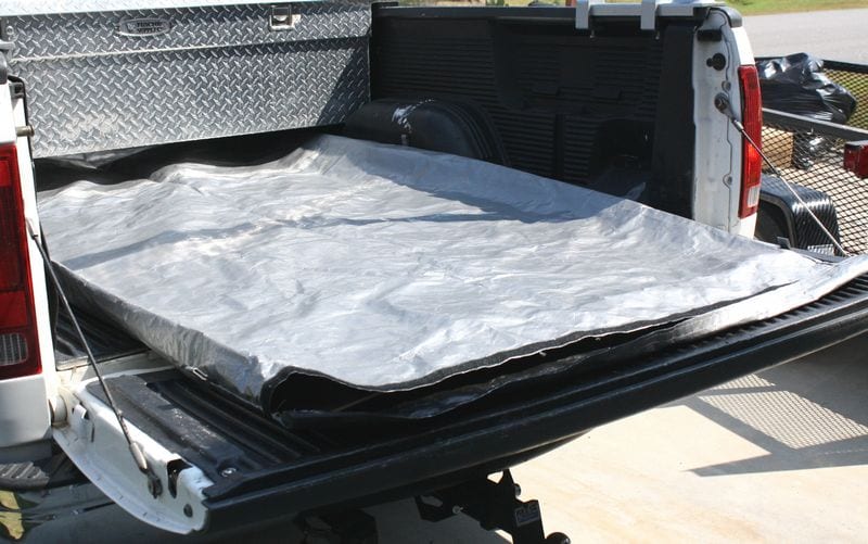 To test the Kerry-All Plywood Pouch, we laid it in the back of my F150 super cab with a 6ft bed. Next, a friend of mine held the pouch open, and I slid in a few sheets of luan flooring underlayment to check out how easy it was to get it into the bag. Once the underlayment was in the pouch, we secured the open end with the hook and loop that was installed along the edges.