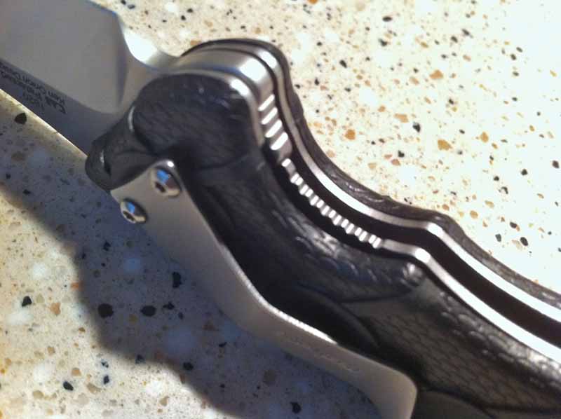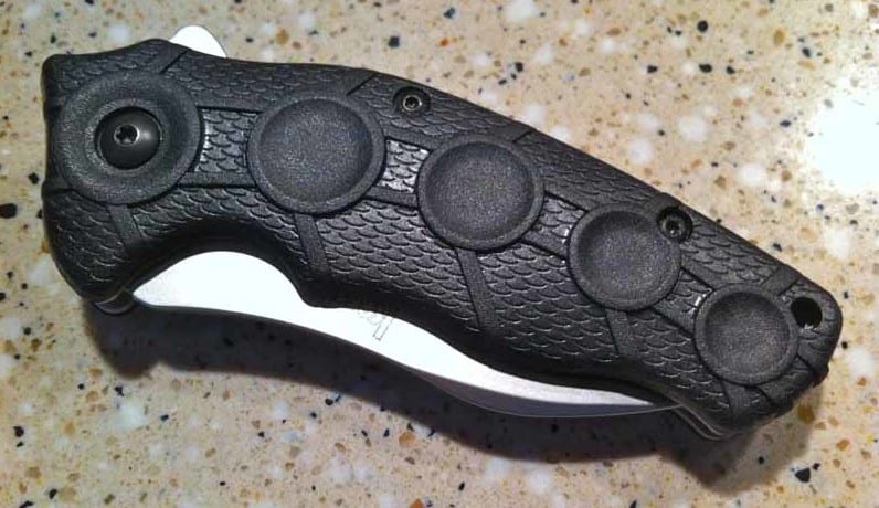 When your eyes take in the Needs Work, itโs not apparent at first what youโre going to get. The design reminds me of something Iโd expect to see in a science-fiction movie. Four retreating circles emanate from the hinge of the knife and give the handle the appearance of having a bit more curve to it than it actually does (in that respect, itโs fairly traditional).