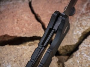 There’s no bearing or spring assist in this knife, but the blade has enough mass to still open quickly using its ambidextrous thumb disk. I prefer a finger flipper over a thumb disk. However, this one is very effective for a single motion deployment. As we’ve said way too often, sorry, Canada, you’re not allowed to carry this one thanks to the deployment.