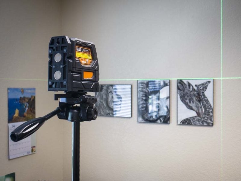 The Laser Level’s swiveling bracket, integrated on the unit, is the first mounting option. It has strong rare earth magnets so find the nearest magnetic surface and you’re off and running. Our campus offices feature metal door frames. We used that to our advantage as we hung photos in our large conference room.
