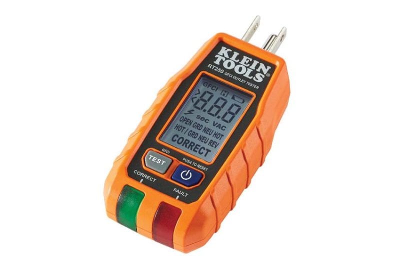 The Klein GFCI Receptacle Tester detects common wiring problems, displays voltage, and inspects GFCIs. It’s small, handy, and with its LCD screen, convenient and simple to take a reading from quickly.