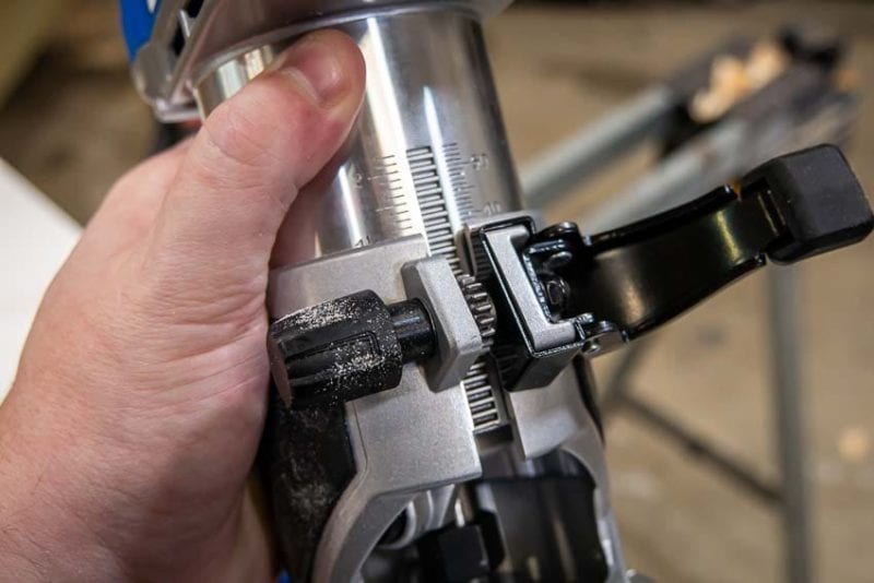 The key highlight is a rank-and-pinion adjustment system. Just release the clamp and use the knob to set the bit height you need. Etched measurements on the motor housing make seeing that height change really easy and it wonโ€™t wear off.
