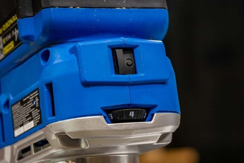 I like the layout of Kobaltโ€™s controls. The power switch, variable speed dial, and depth adjustment are all on the front. The power switch is a standard no-frills mechanical switch.