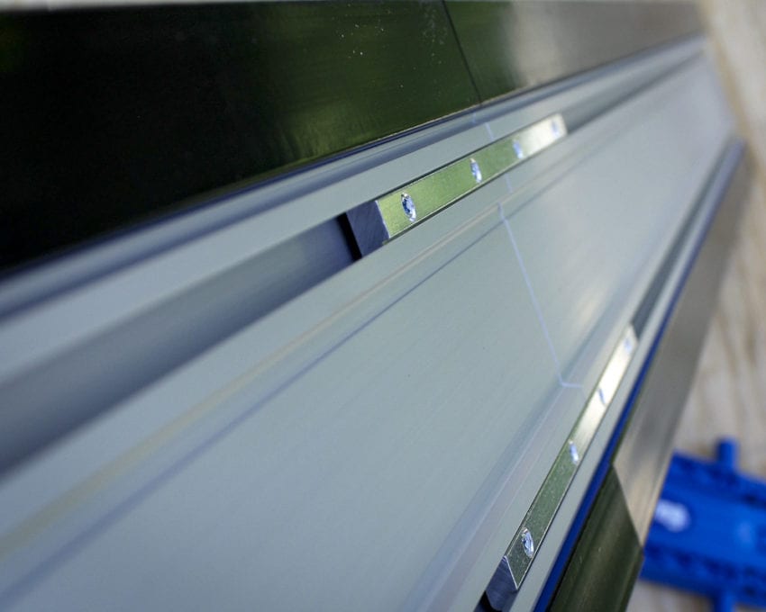 The track features an aluminum construction. On the edges, there is a blue sacrificial material that will not harm your saw blade when you hit it. Like all track saws, the first cut will remove a small part of the material so that it matches perfectly to your saw. Afterward, your saw blade should track exactly against the edge of this material, aiding in less surface chipping of your workpiece while also allowing you to precisely line up your cuts to your marks with the track edge.Under the track are black strips that provide the โgripโ when you lay the track on your material and help keep the track in place.