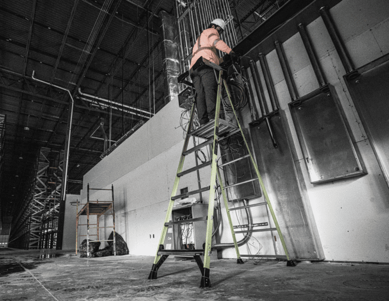 Its fiberglass construction is non-conductive, unlike metal ladders, making it a good fit for electrical work. Additionally, its hi-vis green color helps ensure visibility on dimly-lit jobsites.