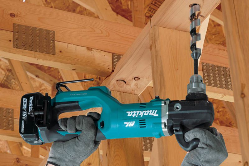 If you donโt need the absolute maximum power that cordless right angle drills can provide, the Makita XAD05 and XAD06 Brushless Right Angle Drills fill that niche well. They both feature two-speed brushless motors that max out at a no-load speed of 1,400 rpm and enough torque to tackle 1-1/2โณ holes with a ship auger bit. With Makitaโs 5.0Ah battery, these drills also have the efficiency to drill up to 200 7/8โณ holes in 2x SPF on a single charge.