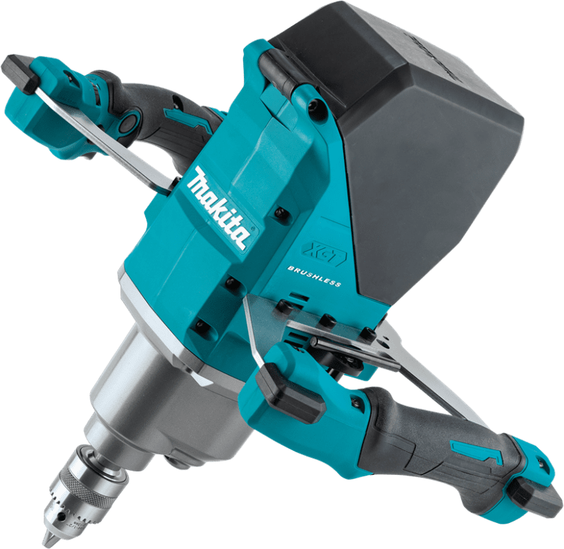 The GTU01 mixer moves from the rear-handle design of Makitaโ€™s 18V model to a dual-handle design that aims to provide better control. It weighs 13.5 pounds including the kitted 4.0Ah battery, so this handle design gives you leverage on both sides to manage that weight.