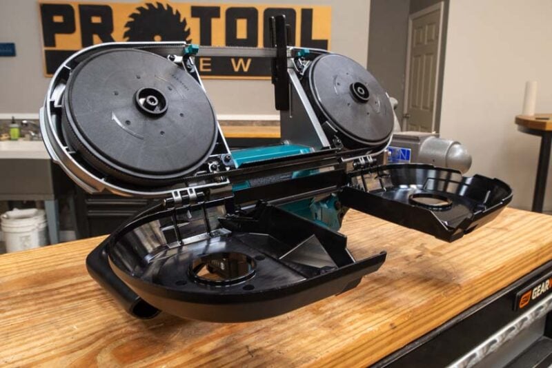 Makita did a great job of making blade changes quick and easy with their tool-free tension release. Slide the lever clockwise to release the tension then open the blade housing to access the pulleys. From there, just work the new blade through the guides on either side of the cutting area and fit it around the pulleys.