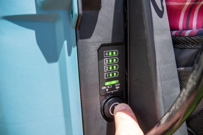 The backpack battery features protection against water intrusion (IPX4), and it has LED indicators on the housing that you the charge level for each inserted battery. You only get two LED lights per battery, but it helps when you want to know if the packs are full before starting your day.