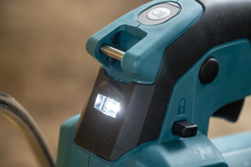 This is Makitaโs first cordless grease gun, they hit the nail on the head ergonomically. The straight handle is very similar to that of a top-handle jigsaw and comfortable to hold. To help manage the toolโs 11.3 weight (with 2.0Ah battery), thereโs a removable shoulder strap and thereโs a lock-on button for those large volume jobs.