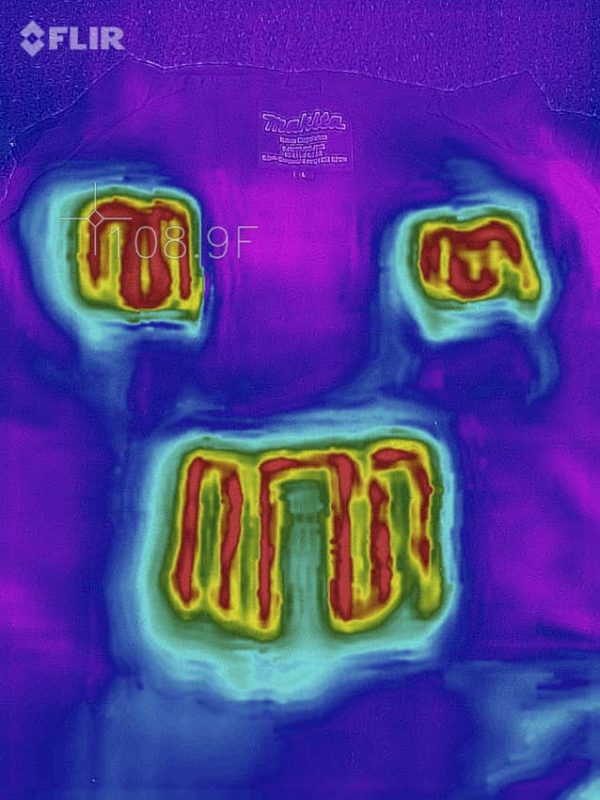 The heating elements react quickly when you turn the heat on, reaching 100ยบ F in about 30 seconds. A quick check with our FLIR One Pro LT shows that it gets up to a maximum of 114ยบ on high. Thatโ€™s on the lower side compared to some of the other models out there. Just keep in mind that itโ€™s still a significant amount of heat to keep you warm and itโ€™s going to last longer than jackets that produce more heat.