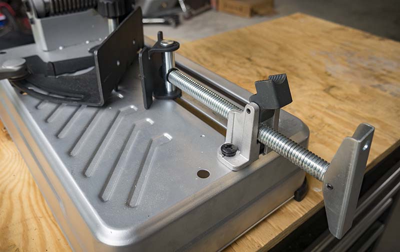 Securingย your material into place is easy thanks to a quick clamp vice. This simple feature makes such a big difference in how fast you can set up your cuts that it makes me want to avoid saws that donโ€™t have it.