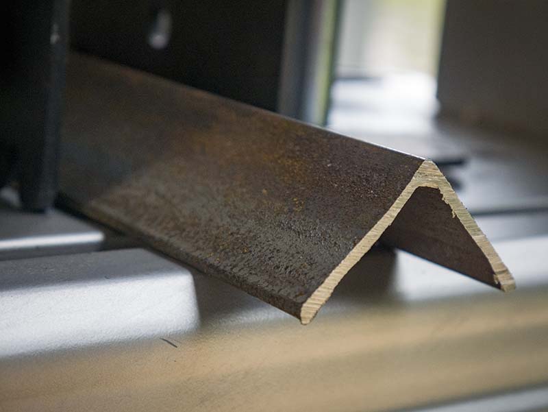 When cutting angle iron, we typically set it peak up. This way we avoid cutting through a large, flat surface at the base and usually cut quite a bit faster. When I clamped the iron in this fashion, it worked just fine at 90 degrees. However, when I went for a 45-degree miter cut, the iron slipped underneath the fence and pushed it up slightly โ€“ and pushed itself to a new angle I wasnโ€™t aiming for. The only solution we found was to cut flat side down at 45 degrees.