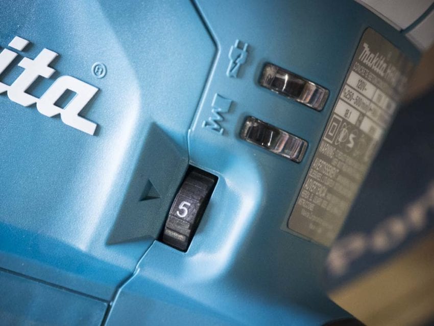 Makita gives you the typical standard modes: chipping and rotation with hammering. Like other premium rotary hammers, thereโs a 3rd stop on the dial to adjust the angle of a chisel. In this mode, you can select any of 24 different positions to work in.