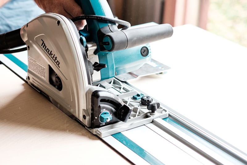 The best feature for me personally is the Makita Track Sawโs ability to make really lonnnnnng compound MITERย cuts. What used to be the domain of the table saw and a taper jig can now be done quickly and accurately with the track saw. Makita has included a button that clips the saw to the rail allowing you to bevel the body of the unit while the plate stays in place on the track. This process is further simplified by the blade entering the work surface at the same place square or beveled. Using Makitaโs innovative track angle accessory you set your angle, rotate the bevel, and cut textbook compound miters as long as you want.