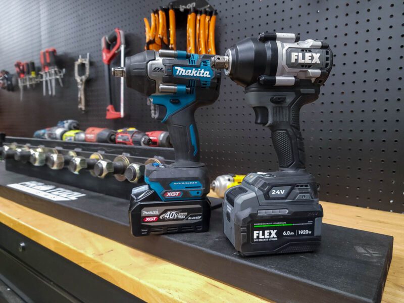 It all starts with battery selection. For this, we went with a 4.0Ah High Power XGT battery for Makita and a 6.0Ah Stacked Lithium battery for Flex. We understand that these arenโt necessarily the same batteries that come in the kits, but we wanted to choose the battery that gave us the best performance without being excessive.