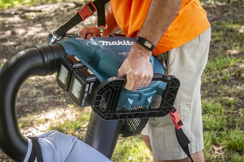Thereโs a price to pay for the additional mass that gives the impeller the ability to mulch and it comes in runtime. With two 5.0Ah batteries, we ran for 8 minutes and 30 seconds on high. With 6.0Ah batteries, youโre looking at a little over 10 minutes. Using Makitaโs battery backpack, it gets you close to 21 minutes.