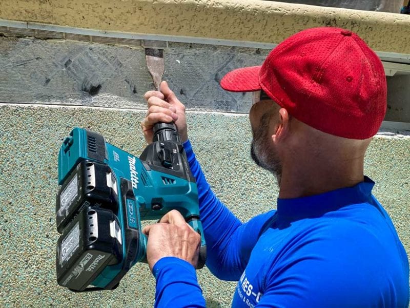 The guys at Aqua Res-Q took to the tile with both tools. It was a race from the stairs to see who could make it all the way around the perimeter. The Makita XRH08 dominated the race, chipping with a lot more authority and precision. However, that task wasnโ€™t a sufficient test for a tool with its capabilities. For that, weโ€™d need to interview the guys about using the tool when chipping through a lot more concrete.