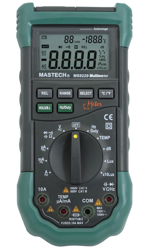 Sometimes it’s nice to have a tool that simply does it all… The newly released Mastech MS8229 Digital Multimeter (DMM) is an improved and modified version of the Mastech MS8209 and does it all. It combines a multimeter, a sound level meter, a thermometer, a luxmeter, and a humidity meter all in a single box. The unit has some very handy features. It provides temperature & humidity display and has an audible + LED warning for correct connection of the probes. The back-lit LCD Screen makes for a very easy-to-read screen, in dark or light rooms.