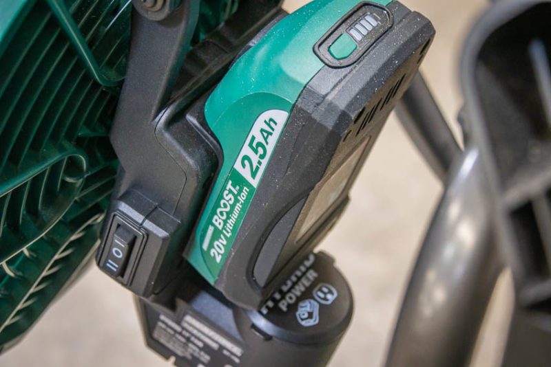 Masterforce claims an 18-hour runtime on low with their Flexpower 20V 7.5Ah battery and itโ€™s compatible with all Masterforce Flexpower 20V batteries. Using a 2.5Ah Boost battery, expect that runtime to be closer to 6 hours.