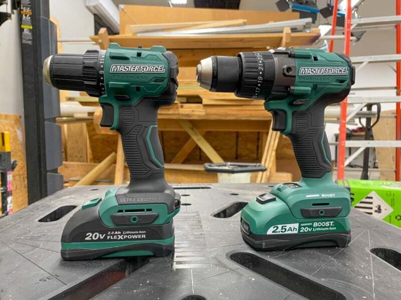 Looking at the Ultra Compact drill compared toย Masterforceโs Boostย model shows us the difference in both size and performance.